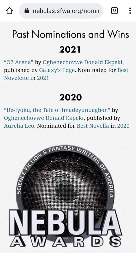My climate fiction novelette O2 Arena just won the Nebula award, making me the first African writer to win the Nebula award with a novelette. I’ll also be the first African born, Black writer to win the Nebula award at all.