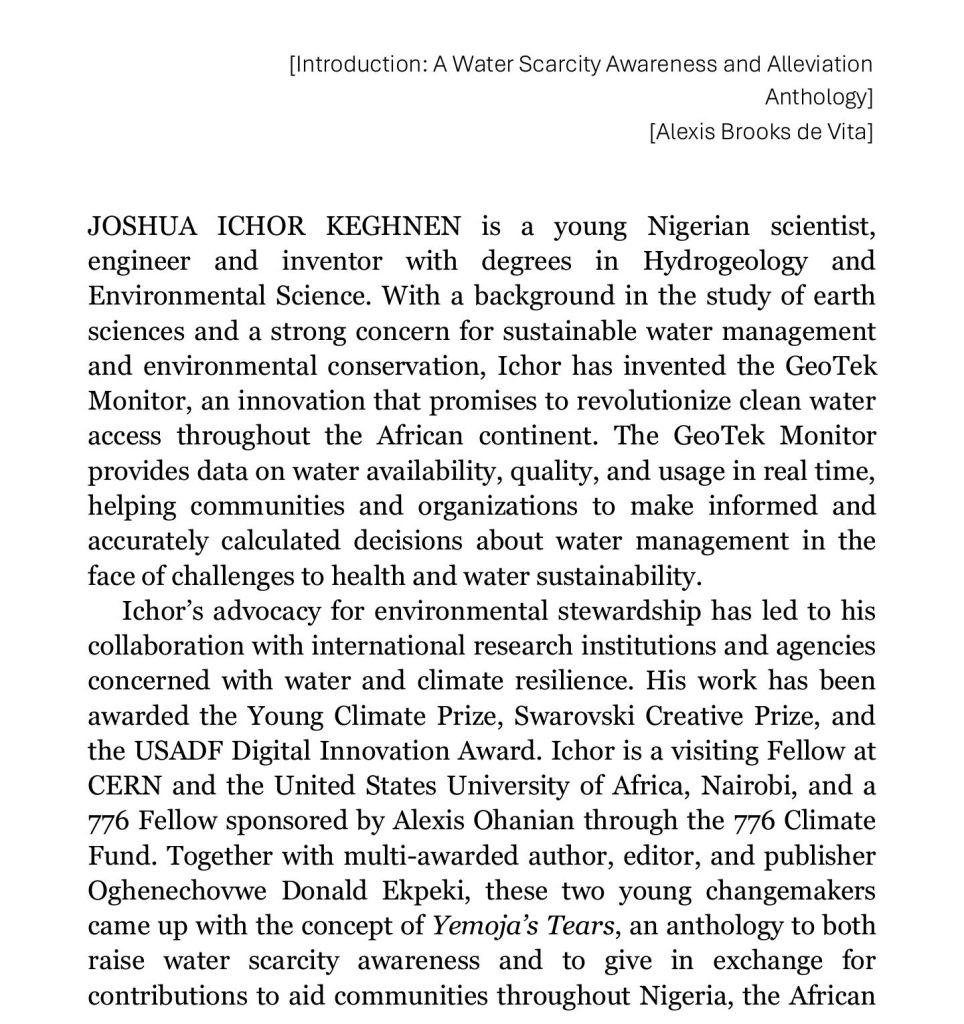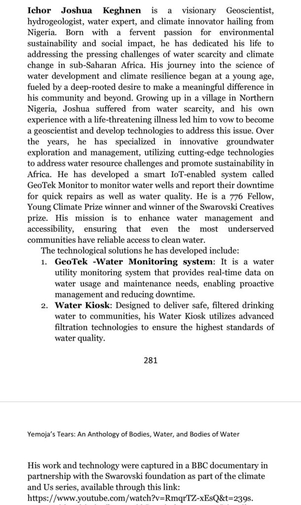 He’s also a Top 25 under 25 of The World Around Young Climate Prize, the first Nigerian recipient of the British Council’s #destinationzeri awards for climate adaptation in Nigeria. He founded Geotek water at 18 & has been exploring for water, constructing more than 1000 water wells. You can see more about his work in