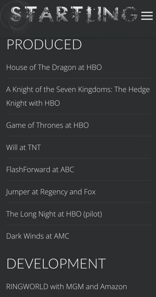 I’m now represented for film/TV/media by Vince Gerardis of Starling Inc, the producer of Game of Thrones, House of The Dragon, the forthcoming Elden Ring movie, and others.