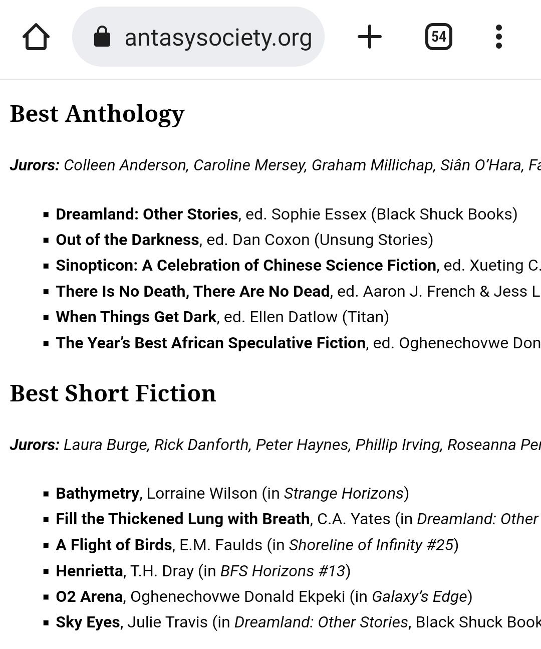 I’m British Fantasy award finalist, for the second time in a row. I’m nominated this time, for writing & editing, in 2 categories; best short fiction & best anthology with my Nebula winning novelette O2 Arena, & WFA, Locus shortlisted anthology, the Year’s Best African Speculative Fiction. Both are Hugo award finalists. Do consider them/meContinue reading “Multiple British Fantasy Award Finalist”